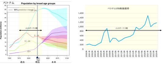 ベトナムの年齢層別人口推移(左)とベトナムVN株価推移(右)