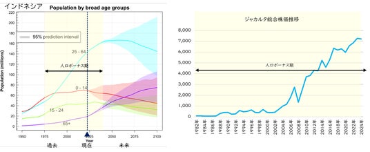 インドネシアの年齢層別人口推移(左)とジャカルタ総合株価推移(右)