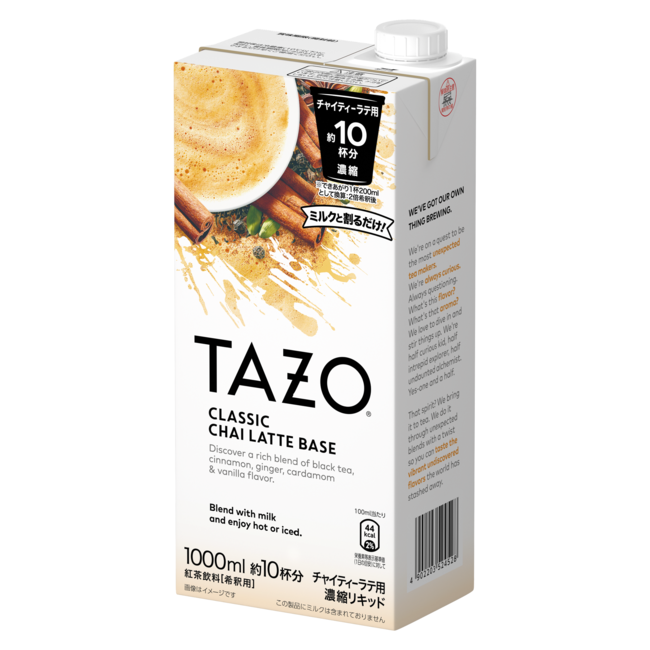 アメリカで定番のチャイティーラテの濃縮リキッド「TAZOクラシックチャイティーラテベース」が、日本に初上陸いたします。華やかな風味が特徴のブラックティーに、シナモンやカルダモン、ジンジャー、ブラックペッパーをブレンドした「TAZO」独自のレシピを開発。茶葉とスパイスの香り高い、コクと深みのある豊かな味わいに仕上げました。牛乳や豆乳、アーモンドミルクなどと1対1で割るだけで、誰でも手軽に本格的なチャイティーラテを楽しむことができます。