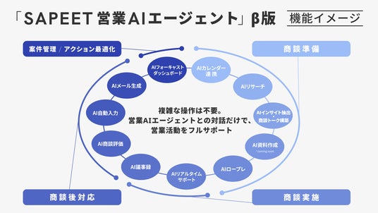 株式会社Sapeet(本社:東京都港区、代表取締役社長:築山 英治、以下Sapeet)は、専門家のナレッジをAIで再現・活用するExpert AI事業の一つとして、BtoB(企業間取引)営業組織向け「SAPEET 営業AIエージェント」β版を、2026年1月より提供開始します。