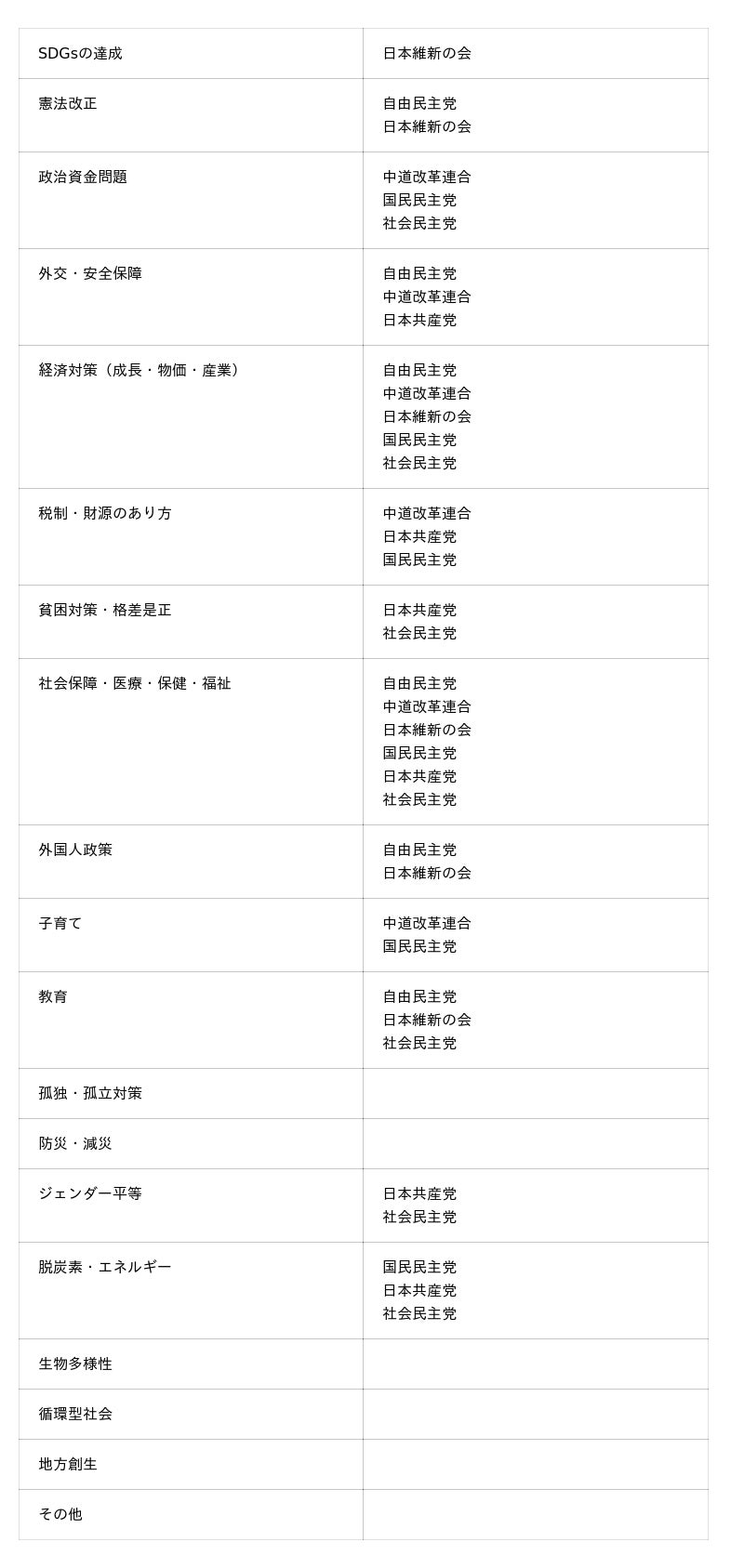 第51回衆議院議員選挙にあたり、(一社)SDGs市民社会ネットワーク(SDGsジャパン)は国会に議席を有し、今回の選挙で候補者を擁立した政党を対象に、「SDGsに関する政党アンケート」を実施しました。