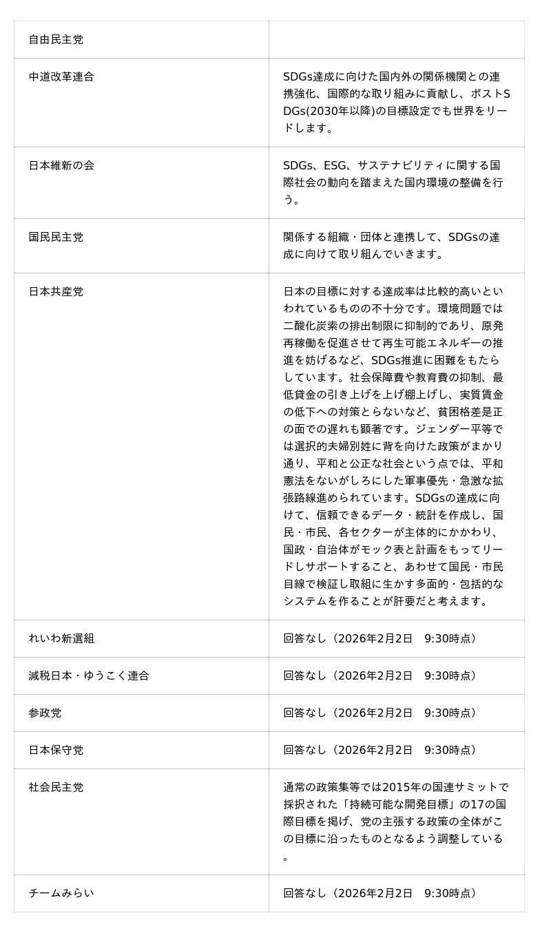 SDGsジャパンでは、2021年以降、継続して政党アンケートを実施してきました。今回も、各政党がSDGsをどのように捉え、どのような姿勢で取り組もうとしているのかを可視化することを目的として行いました。