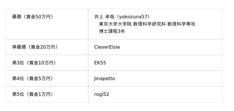最終順位では1位の井上氏が高い性能を示して、2位以下を大きく引き離す結果となりました。一方で、2位以下は僅差の争いとなり、それぞれに特徴のある工夫が高い水準で実装されていました。