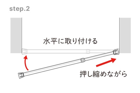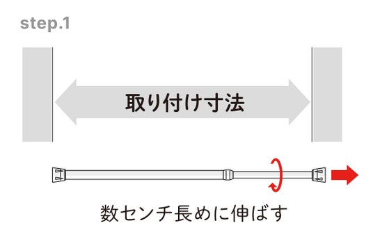 あらかじめ壁の幅より「数cm長く」伸ばしておき、バネを押し込みながら取り付ける。