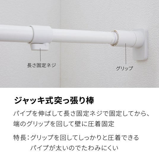 パイプを回せば回すほど強い力がかけられる独自の内部構造により、手軽なサイズ感でありながら、ジャッキ式の突っ張り棒に匹敵する圧着力で壁を力強く押し返し、しっかりと固定します。