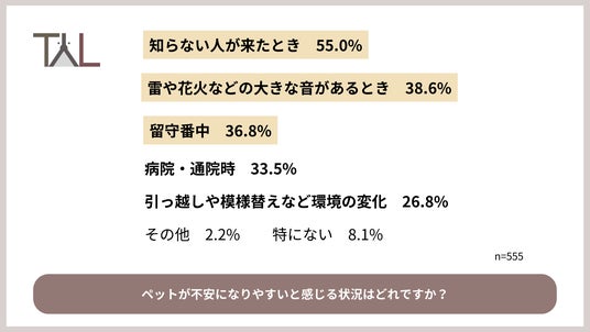 また、犬猫の飼い主555名に対して「ペットが不安になりやすいと感じる状況はどれですか?」と質問したところ、過半数が「知らない人が来たとき」(55.0%)と回答しました。次に多かったのが「雷や花火などの大きな音があるとき」(38.6%)と「留守番中」(36.8%)で、「病院・通院時」(33.5%)という回答も見られました。