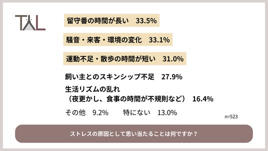・ストレス原因の多くは「留守番の時間が長い」、「騒音・来客・環境の変化」、「運動不足・散歩の時間が短い」など。春は「生活リズムの乱れ」や「環境の変化」に要注意