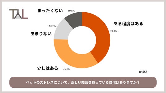 犬猫の飼い主555名に対し「ペットのストレスについて、正しい知識を持っている自信はありますか?」と質問したところ、「ある程度ある」(13.7%)、「少しはある」(40.4%)、「あまりない」(35.1%)、「まったくない」(10.8%)という結果に。「ある程度ある」(13.7%)と「少しはある」(40.4%)の回答を合わせて約6割の飼い主が「ペットのストレスについて正しい知識に自信がない」と回答しています。
