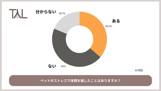 また、犬猫の飼い主555名に対して「ペットがストレスで体調を崩したことはありますか?」と質問したところ、36.2%の飼い主が「ある」と回答しました。犬猫の飼い主の3分の1が体調への影響も経験しており、ストレスが日常に潜む健康リスクとなっていることが伺えます。