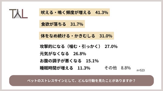 Q1で「まったくない」と回答した方を除く犬猫の飼い主523名に対し「ペットのストレスサインとして、どんな行動を見たことがありますか?」と質問したところ、「吠える・鳴く頻度が増える」(41.3%)、「食欲が落ちる」(31.7%)、「体をなめ続ける・かきむしる」(31.0%)などの回答が多く寄せられました。その他にも「攻撃的になる(噛む・引っかく)」(27.0%)、「元気がなくなる」(26.8%)などの回答も見られ、ペットによって様々なストレスのサインがあることが分かります。