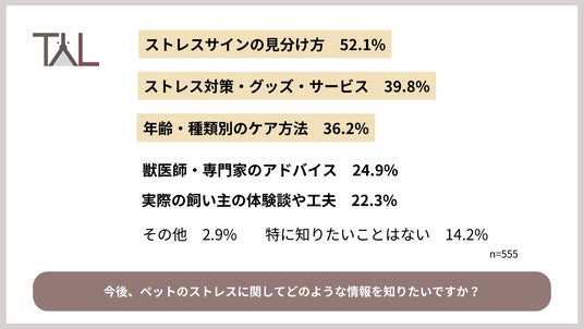 犬猫の飼い主555名に対し「今後、ペットのストレスに関してどのような情報を知りたいですか?」と質問したところ、半数以上が「ストレスサインの見分け方」(52.1%)と回答しました。その他に「ストレス対策グッズ・サービス」(39.8%)や「年齢・種類別のケア方法」(36.2%)、「獣医師・専門家のアドバイス」(27.4%)などを求める声も。どんなケアをすればいいのかが分かるような情報を求める飼い主が多いことが伺えます。