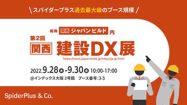 スパイダープラス株式会社(本社:東京都港区、代表取締役社長:伊藤謙自、証券コード:4192 東証グロース、以下「スパイダープラス」)は、2022年9月28日(水)からインテックス大阪で開催される『ジャパンビルド -建築の先端技術展-内 第2回 建設DX展』に出展いたします。