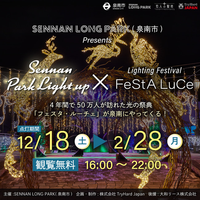株式会社TryHard Japan(大阪市中央区)は、SENNAN LONG PARKにて2021年12月18日(土)より2022年2月28日(月)までウィンターイルミネーション『SENNAN PARK LIGHT UP × フェスタ・ルーチェ」の開催を発表します。