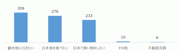 「日本に旅行する理由は何ですか」というアンケート(複数選択)については、「観光地に行きたい」が1位で309件(90.4%)とほとんどの回答者が観光を強い関心を持っていました。次いで「日本食を食べたい」が276件(80.7%)。「日本で買い物をしたい」は3位で233件(68.1%)でした。訪れたいエリア(単一選択)については、北海道の人気が高く115件(33.6%)、関東(茨城、栃木、群馬、山梨、長野、埼玉、千葉、東京、神奈川)が87件(25.4%)、九州(福岡、佐賀、長崎、大分、熊本、宮崎、鹿児島)が43件(12.6%)、近畿(滋賀、京都、奈良、和歌山、大阪、兵庫)が39件(11.4%)でした。昨年秋に当社が実施したアンケートでも訪日の目的は、「買い物」より「観光」を希望する人が多く見受けられましたが、引き続きその傾向となっています。