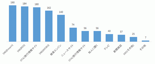 日本関連の情報収集に関してのアンケート(複数選択)では、やはりSNSとOTA/旅行情報サイトが上位を占めています。「Douyin(中国版TikTok)」が190件(55.6%)、「RED(中国版インスタグラムともいわれています)」が184件(53.8%)、「Weibo(中国版Twiterともいわれています)」が162件(47.4%)と上位を占めています。続いて「検索エンジン」が140件(40.9%)、「ニュースサイト」が74件(21.6%)でした。