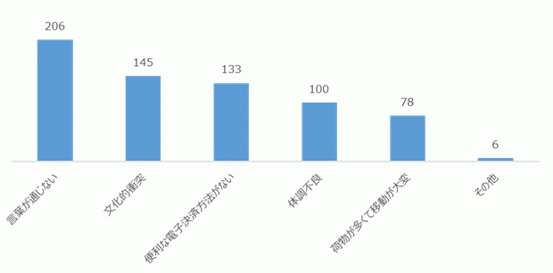 訪日時の懸念点についてのアンケート(複数選択)は、やはり「言葉が通じない」が最も多く、206件でした。次に「文化的衝突」と回答した人が145件、「便利な決済方法がない」が133件でした。『決済方法』に関しては、昨年秋のアンケート(全回答数は998件)でも、「積極的にWechat Payやアリペイ等の電子決済を使いたい」が43.3%、「電子決済、クレジットカード、現金の順番に使用」が240件(24.0%)と大多数で、「積極的に現金を使いたい」は139件(13.9%)と、少数にとどまっているなど、キャッシュレス化が中国人観光客の新たなニーズと言えるでしょう。