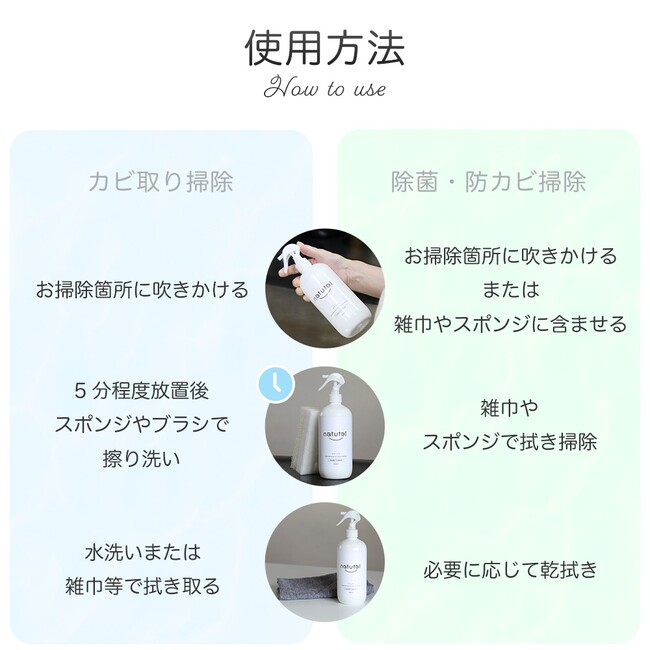 刺激の強い薬剤と違い自然由来の除菌成分でカビの酵素を分解します。