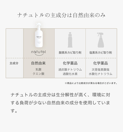 natutolのカビ取り成分は自然由来の発酵乳酸を使用し、素肌と同じ弱酸性。