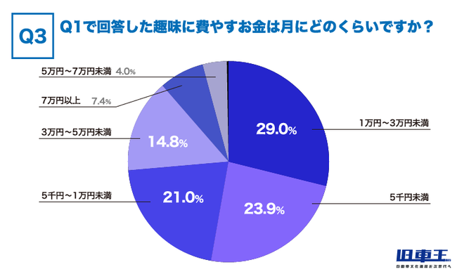 Q1で回答した趣味に費やすお金は月にどのくらいか聞いてみると、1位が「1万円~3万円未満」で29.0%、2位が「5千円未満」で23.9%、3位が「5千円~1万円未満」で21.9%という結果になりました。