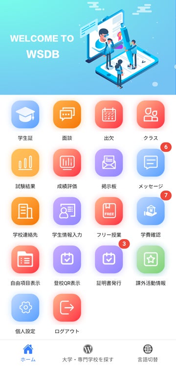 WSDBは、留学生Web出願から卒業後まで一括で管理可能な「国際学生管理システム」を販売しており、無償の学生用スマホアプリを提供することで、学習のICT化も促進課しています。