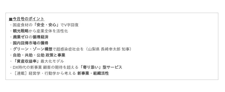 また、食の安全安心や、森林資源の有効活用、廃棄物のリサイクル、地域の身近な観光資源を活用した観光業など、これまで大切だと言われながら進展が進みにくかった分野で、変化のスピードが明らかに上がっていることも確認できました。それらの分野では、国内生産・国産化や地域分散といったことがコロナ禍以前のキーワードでしたが、今では、その捉え方が、より切実に、真剣に切望されるようになりました。本号では地域の新たな、そして具体的な事例への取材をを通じて、新時代のビジネスの在り方を展望します。