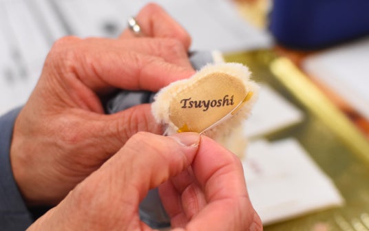 当店では、ほとんどのテディベアの足裏にお名前や記念日がプリント可能で、足裏プリントは、すべて本社にある「制作工房」で1点1点手作業で丁寧に仕上げられます。量産品にはない温かみがあり、大切な人へのプレゼントや記念品に最適です。