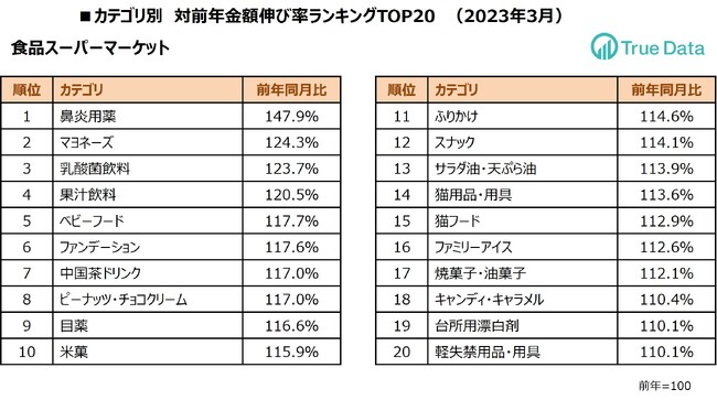 ~ドラッグストア、食品スーパーマーケット 2023年3月の対前年伸び率TOP20カテゴリを発表 ~