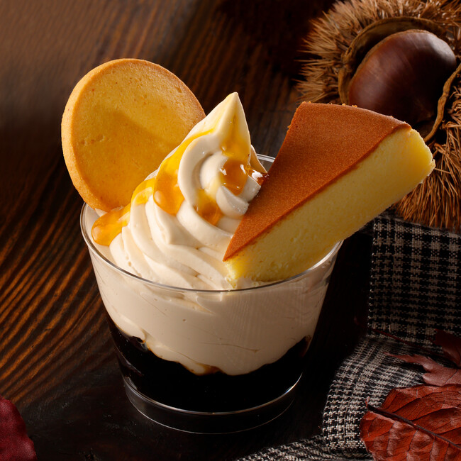チーズケーキとチーズクッキーをのせたサンデーに、季節限定フレーバー『チーズケーキサンデー 芋栗かぼちゃ』が新登場します。まろやかな甘さが特長の黒糖ゼリーにベイクドチーズケーキの風味がお楽しみいただけるチーズケーキソフト、季節限定商品『御用邸栗チーズケーキ』『パンプキンチーズクッキー』をトッピングし、最後には安納芋ソースをあわせました。秋の旬の味覚である、芋・栗・かぼちゃを一度に楽しむことのできる贅沢なスイーツとなっています。