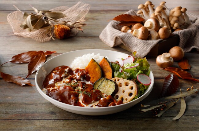 牛肉のうま味を引き出したビーフシチューソースにサワークリームをあわせた、程よい酸味がお楽しみいただける、チーズガーデンオリジナルのビーフストロガノフです。具材には、しめじやマッシュルームを使用し食感の変化を、また、かぼちゃやレンコンなど秋野菜を素揚げし、トッピングすることで食べ応えも満点になっています。最後のトッピングにはアクセントとして粉チーズを振りかけることで塩味がプラスされ、ルーを混ぜることで味わいの変化もお楽しみいただけます。