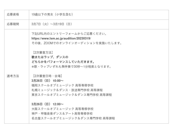 高等課程だけでなく専門課程でもK-POPコースのあるTSM。韓国の芸能事務所との関係性は日本の専門学校でもトップクラスです。その縁もあって今回のオーディションを開催することになりました。