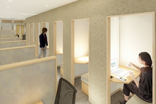 施設内のデザインは、落ち着いたトーンのグレージュカラーと、ポイントに淡いブルーをあしらい、爽やかで落ち着く空間を目指しました。また、各席に間仕切りを設けたり、オフィスチェアだけでなくソファ席を設けたりするなど、約30坪※2のコンパクトな空間ながらも居心地の良さと集中できる環境を両立させています。