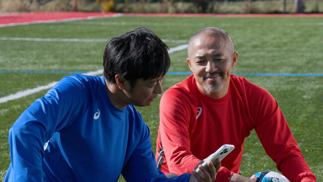 当日は晴天に恵まれ、またお二人が慣れ親しんだサッカーコートでの撮影ということもあり、終始リラックスした様子で撮影が進行していきました。撮影の合間には、小野さんの提案で、スタッフも交えながらボール回しを行う場面も。憧れの小野さんとボールを蹴るという貴重な機会に、尾形さんは「うわぁ・・・嬉しい・・・。嬉しくない!?」と喜びを噛みしめている様子。「やっぱみんなでこうやってやると楽しいよね」と、サッカーを心から愛している小野さんの姿と、全ての勝負に全力で挑む真っすぐな尾形さんの姿が印象的な撮影となりました。