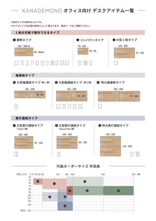 今回発売する最大奥行200cmの「特大デスク」の他、オフィス空間や作業スペースにぴったりの「大型デスク」にバリエーションを追加しました。