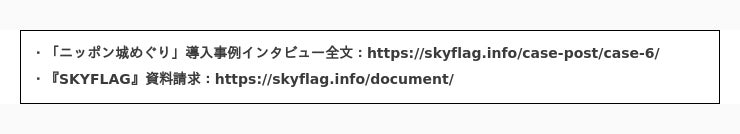 ・「ニッポン城めぐり」導入事例インタビュー全文:https://skyflag.info/case-post/case-6/
