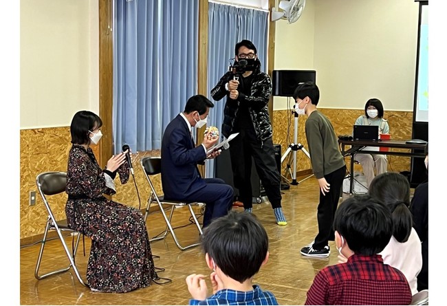 その後、2名は上仁頃小学校を訪問し、児童とふれあいました。上仁頃小学校は、杉対策監が発案し、現在も名誉会長を務めている『アジア国際子ども映画祭』に作品を出展した経験のある学校で、今年度で合併のため閉校してしまうということで訪問しました。歓迎してくれた児童に向けて、杉対策監は映画祭の思い出などについて述べた後、「皆さんのおじいちゃんおばあちゃんに伝えてほしいことがあります。それは特殊詐欺についてです。特殊詐欺というものを知っていますか?これは皆さんのおじいちゃんおばあちゃんを狙って、お金をたくさん奪い取ってしまうことで、被害が全国で相次いでいます。北見市の警察署で特殊詐欺の話をしてきましたが、北見市も還付金詐欺等の被害があり、多くの犯人は電話でお金の話をしてきます。皆さんがおじいちゃんおばあちゃんに『電話でお金の話が出たら電話をすぐに切って』と伝えてあげることで、たくさんの特殊詐欺の被害を防ぐことができるので、家に帰ったら話してみてください。」と特殊詐欺の被害を防ぐために、児童へメッセージを送りました。