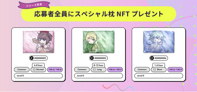 今回「#SLEPN」のリリースを記念して、人気NFTコレクション『異世界アニメ・キャラクターズ(英名:Isekai Anime Characters)』とコラボレーションした「スペシャル枕NFT(トークン獲得量15%UP)」を応募者全員にプレゼントいたします。