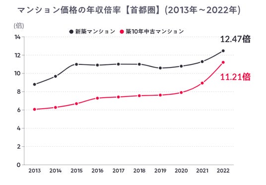 近年の建築労務費・建築資材の原価高騰などを受けて新築分譲マンションの供給減少や価格高騰が続く中、新築・中古マンション購入の年収倍率は首都圏で11~12倍、近畿圏でも8~10倍と10年前と比べて+3~5ポイント高くなり、生活者にとってより高い買い物になってきています。