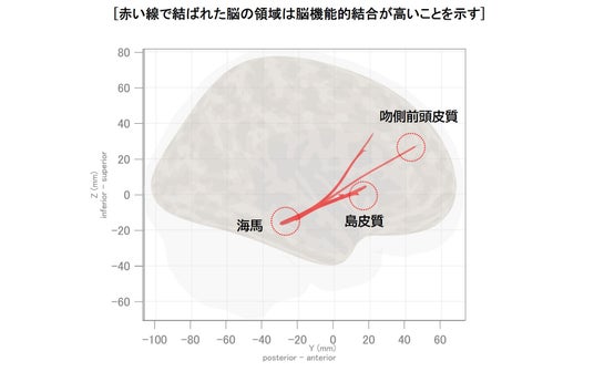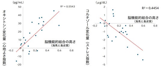 図5 海馬と島皮質の脳機能的結合の高さと、心地よさとストレス軽減との関連