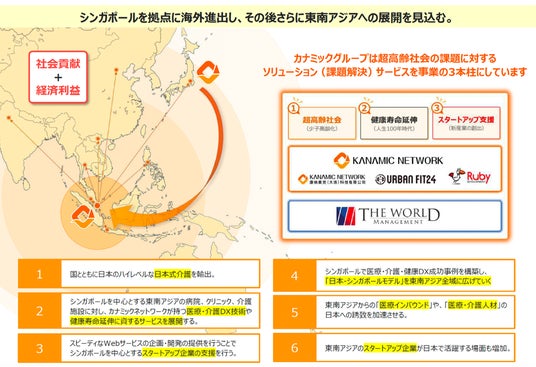シンガポールを技術・ビジネスモデルの移転拠点として位置付け、マレーシア・タイ・ベトナム等のASEAN諸国への横展開を推進します。高齢化が急速に進展するアジア地域において、「社会貢献+経済利益」の両立を実現してまいります。