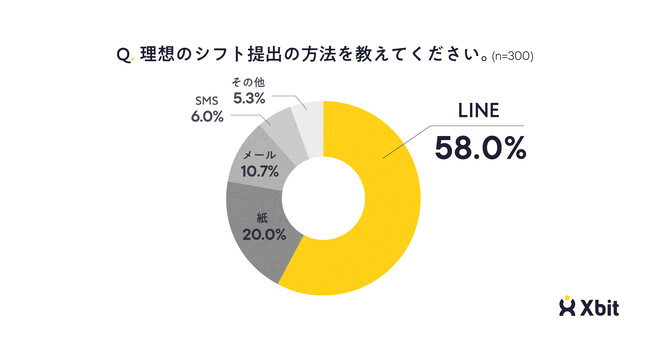 理想のシフト提出の方法を尋ねたところ、「LINE」が58.0%で最も多く、「紙」が20.0%、「メール」が10.7%と続きました(n=300)。