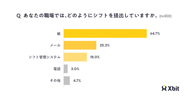 職場におけるシフト提出の方法を尋ねたところ、「紙」が64.7%で最も多く、「メール」が25.3%、「シフト管理システム」が18.0%と続きました(n=300)。
