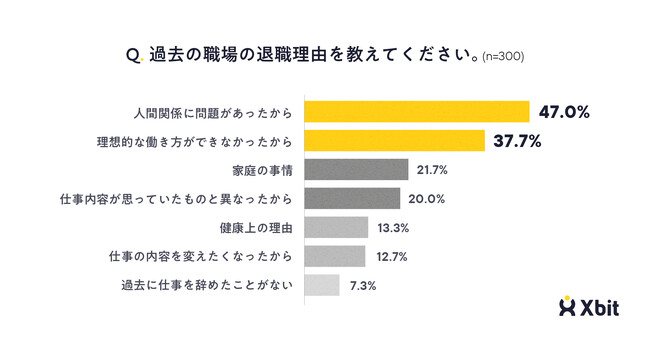 過去の職場の退職理由を尋ねたところ、「人間関係に問題があったから」が47.0%で最も多く、「理想的な働き方ができなかったから(希望シフトに入れない、給与が見合わない、過重労働、評価されない、など)」が37.7%と続きました(n=300)。