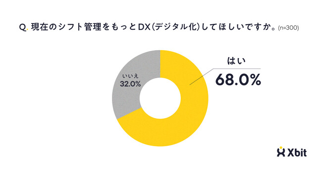 現在のシフト管理をもっとDX(デジタル化)してほしいか尋ねたところ、68.0%が「はい」と回答しました(n=300)。