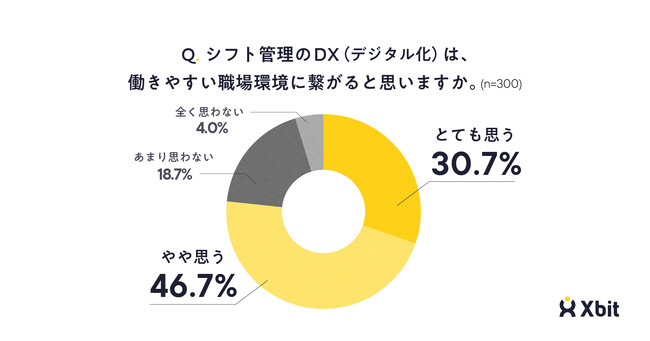 シフト管理のDX(デジタル化)が、働きやすい職場環境に繋がると思うか尋ねたところ、「とても思う」「やや思う」が合わせて77.4%で、約8割が働きやすい職場環境に繋がると思っていることがわかりました(n=300)。