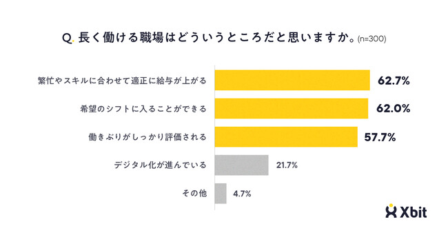 どのような職場が「長く働ける職場」だと思うか尋ねたところ、「繁忙やスキルに合わせて適正に給与が上がる」が62.7%で最も多く、「希望のシフトに入ることができる」が62.0%、「働きぶりがしっかり評価される」が57.7%と続きました(n=300)。