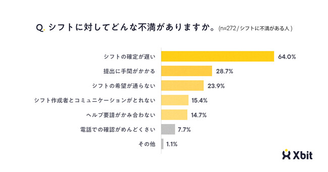 シフトに対して不満があるか尋ねたところ、「シフトの確定が遅い」が64.0%で最も多く、「提出に手間がかかる」が28.7%、「シフトの希望が通らない」が23.9%と続きました(n=272)。