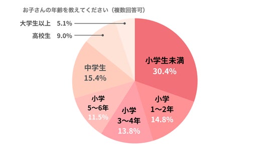 調査対象者の子供の年齢は、「小学生未満(30.4%)」が約3割、「小学1~2年生(14.8%)」「小学3~4年生(13.8%)」「小学5~6年生(11.5%)」が合わせて約4割。