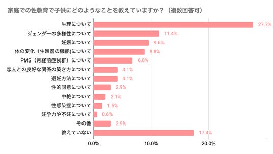 家庭での性教育の内容は「生理について(27.7%)」が最も多く、次いで「ジェンダーの多様性について(11.4%)」「妊娠について(9.6%)」が多い結果に。反対に、「妊孕力や不妊について(0.6%)」が最も少なく、次いで「性感染症について(1.5%)」「中絶について(2.1%)」が少ない結果に。