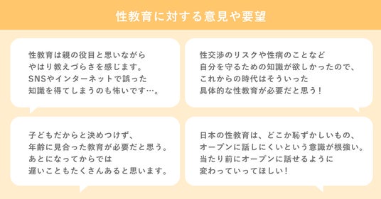 ・性交渉のリスクや性病のことなど自分を守るための知識が欲しかったので、これからの時代はそういった具体的な性教育が必要だと思う。