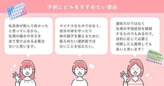 子供にピルをすすめたいかという設問では「すすめたい(81.7%)」が8割を超える結果となりました。実際に自身が飲んだことで、「生理不順やPMSの改善の効果を感じたから」という理由が多く、子供自身の生活や人生を考える上で、ピルを飲むという選択肢も視野に入れて欲しいと考えている人が多いことが伺えます。